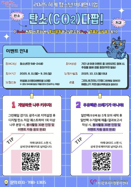 이번 사업은 비대면사업으로 센터의 ‘그린웨일 사업’, ‘종이팩특공대 사업’과 협업하여 무더위로 인한 온열질환 등 여름철 야외 봉사활동 시 발생할 수 있는 안전사고 위험을 줄이는 동시에, 청소년들이 가정이나 일반팩수거함 거점에서 환경보호 봉사활동을 실천할 수 있도록 구성됐다.