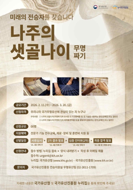 단절 위기의 전통 기술인 '나주의 샛골나이(무명짜기)'의 미래 전승자를 발굴하기 위한 이번 공모를 통해 선정된 참여자는 3년간(2026~2028) 미래 전승자 육성을 위한 교육 프로그램을 지원 받을 수 있다.