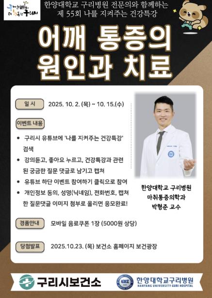 [세계로컬타임즈] 구리시는 오는 10월 2일, 시민들의 근골격계 질환 예방과 건강관리 역량 강화를 위해 '어깨 통증의 원인과 치료'를 주제로 한양대학교 구리병원 마취통증의학과 박형준 교수와 함께하는 ‘나를 지켜주는 건강특강’을 구리시 공식 유튜브 채널(구리비전)을 통해 송출한다고 밝혔다.