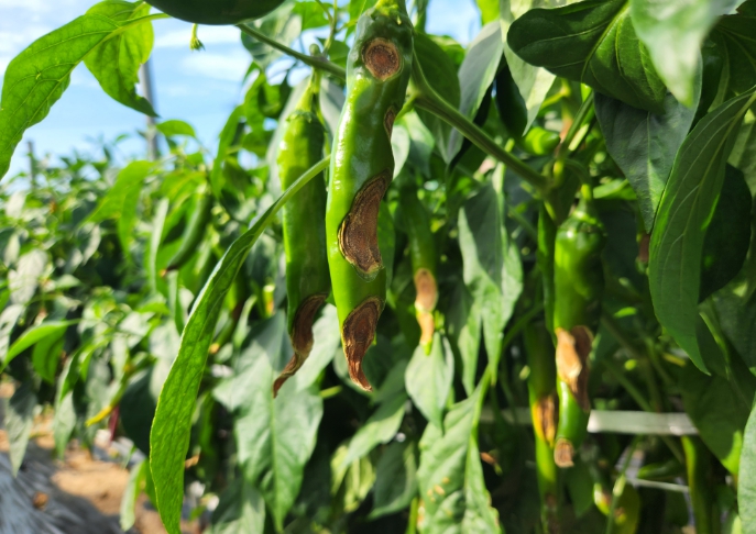 주로 고추 끝부분이 함몰되는 칼슘 결핍증상은 수분 불균형 등 재배환경에 의해 발생하므로, 칼슘 엽면시비 및 건조하거나 과습되지 않도록 물 관리를 해야 한다.