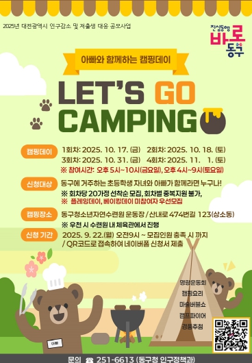 박희조 동구청장은 “이번 캠핑데이는 아빠와 자녀가 함께 야외에서 다양한 활동을 즐기며 소통하고 추억을 쌓는 소중한 기회가 될 것이라며 “앞으로도 가족이 함께 어울리며 행복을 나눌 수 있는 프로그램을 지속적으로 확대해, 구민이 체감할 수 있는 가족친화 도시를 만들어 가겠다”고 말했다.