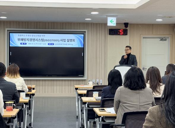이를 위해 11일, 충청남도교육청교육과정평가정보원(홍성)에서 부패방지경영시스템(ISO 37001) 운영 내재화·지속적 개선을 위한 사업설명회를 개최하고, 사후 인증심사 대응 방향과 부패 위험성 개선 방안, 부서별 역할과 협조 사항을 공유했다.