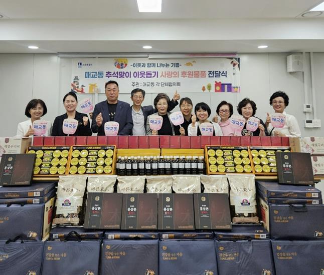 이번 추석 명절 사랑의 후원물품 전달식을 위해, 관내 유관기관 및 매교동 단체(주민자치회, 지역사회보장협의체 등)에서 후원했고 쌀 10kg 20포, 참치햄 세트 125개, 홍삼세트 6개, 경옥고 28개, 맛간장 100개 등 700만원 상당의 물품이 후원됐다.