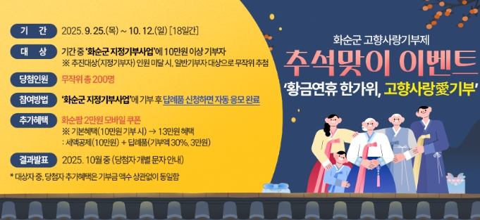 [세계로컬타임즈] 화순군은 민족 대명절 추석을 맞아 고향사랑기부제 감사 이벤트인 ‘황금연휴 한가위, 고향사랑愛기부’를 오는 9월 25일부터 10월 12일까지(18일간) 진행한다고 밝혔다.