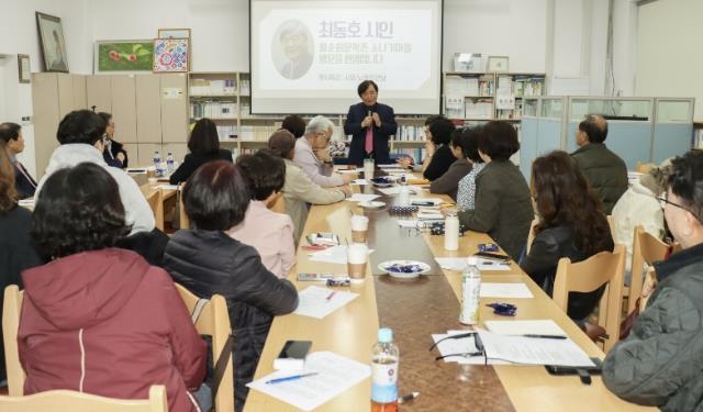 강연 후에는 김종회 촌장과의 대담과 청중 질의응답이 이어졌으며, 마지막에는 최 시인의 아내이자 시인인 김구슬 시인이 남편의 시 '노인과 수평선'을 한국어와 프랑스어로 연이어 낭송해 청중들의 뜨거운 박수를 받았다.
