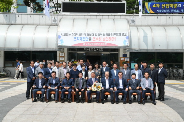 | ▲ 29일 백경현 구리시장은 시청 본관 입구 광장에서 간부들과 이임식 사진을 담는 모습. <사진제공=구리시> |