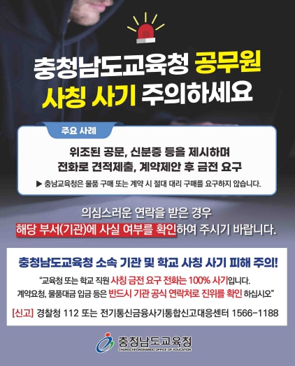 만약 이미 금전적 피해가 발생했거나 사기 시도가 명확할 경우, 즉시 담당 경찰서(112)에 신고하고 충남교육청 감사관실에 제보해야 한다.