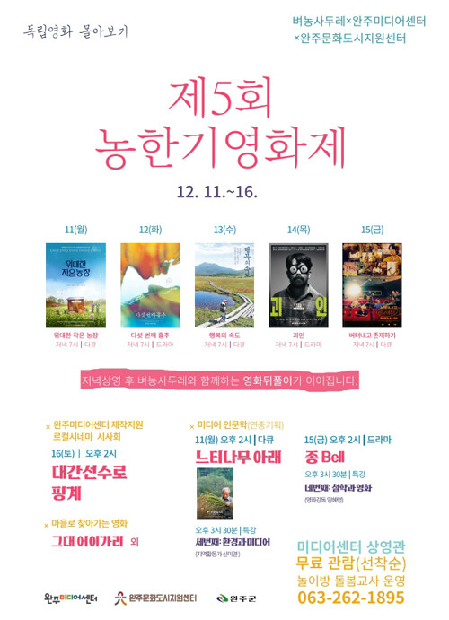 9일 전북 완주군에 따르면 ‘제5회 농한기영화제’가 완주미디어센터에서 오는 11일부터 16일까지 열린다. 주민공동체 ‘벼농사두레’가 작품 선정과 진행을 맡았다.