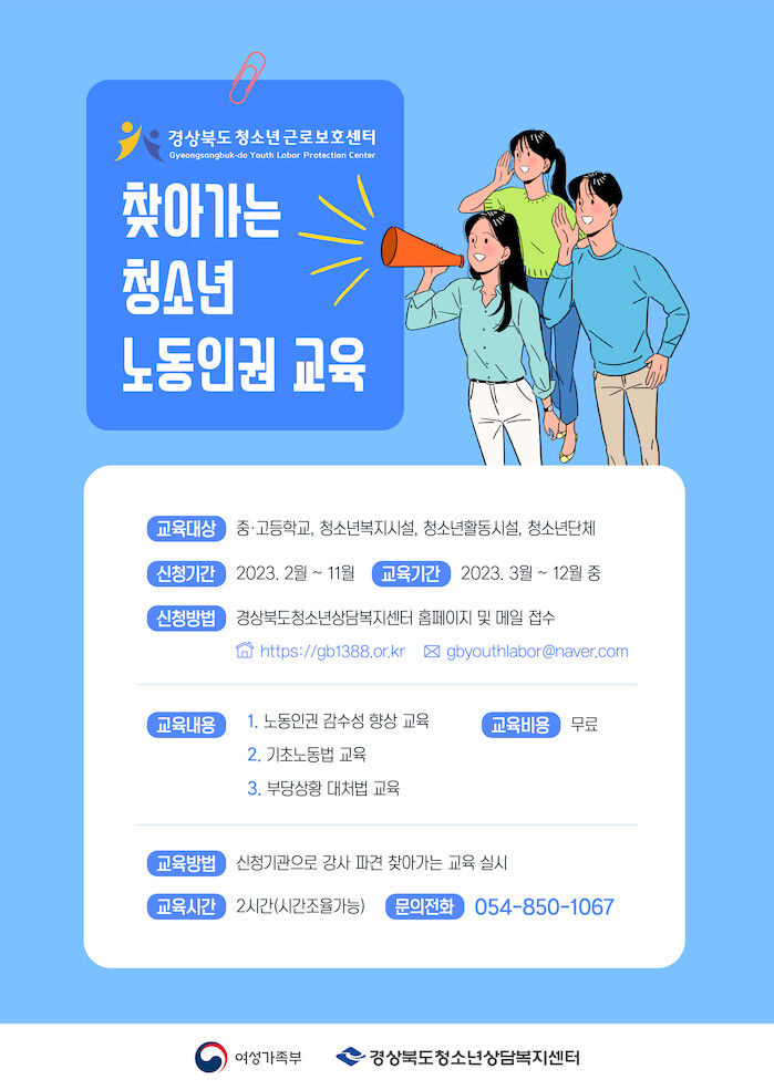 찾아가는 노동인권교육은 청소년 유관기관 및 중·고등학교 재학생 등 청소년을 대상으로 노동인권감수성, 기초노동법, 부당처우 대처방법 등을 교육하며 경상북도청소년상담복지센터 홈페이지를 통해 상시 신청할 수 있다.