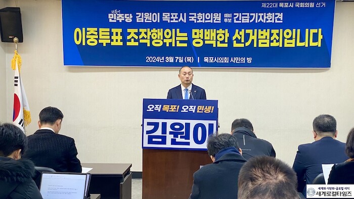 전날 긴급 기자회견을 열어 배 후보 측의 조직적이고 광범위한 이중투표 조작행위 의혹을 제기한 김원이 예비후보는 해당 사건을 당 선관위, 목포시 선관위에 신고하고 목포경찰서에도 고발장을 접수한 바 있다.