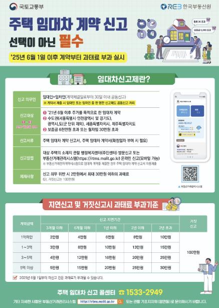 정기호 부동산관리과장은 “주택 임대차계약 신고제는 주택 임대차 시장의 투명성 확보와 임대·임차인 간 정보 비대칭을 해소하기 위한 제도”라며 “6월부터는 계도기간이 종료되므로 반드시 기한 내 신고해 불이익을 받지 않도록 유의해주시길 바란다”고 말했다.