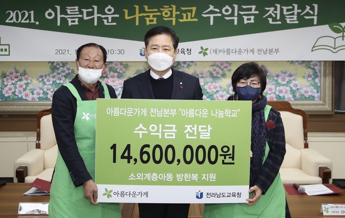 전라남도교육청과 (재)아름다운가게전남본부는 2018년부터 나눔장터 및 아름다운 나눔학교 운영을 함께 하고 있으며 교육가족들이 기증한 헌 옷과 생활용품을 판매한 수익금으로 취약계층 학생들을 지원해왔다.