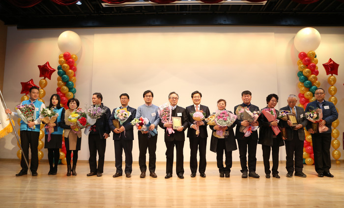 | ▲ 충남 당진시자원봉사센터가 개최한 2017년 자원봉사자의 날을 맞아 상을 받은 수상자들이 기념촬영을 하고 있다. |