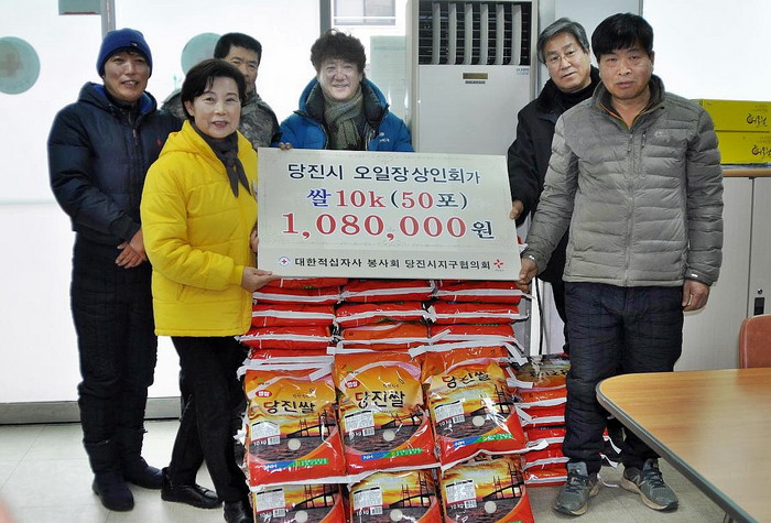 당진시 오일장상인회는 당진시장에 터를 잡고 100여명의 회원들이 당진지역에서 벌어들인 소득 일부를 지역사회에 환원하고자 7년여 동안 장학금을 전달해 왔으나 올해는 경제적으로 어려운 시기에 방법을 모색하던 중 당진쌀을 구입 당진지구협의회를 찾아 이웃 사랑을 실천했다.