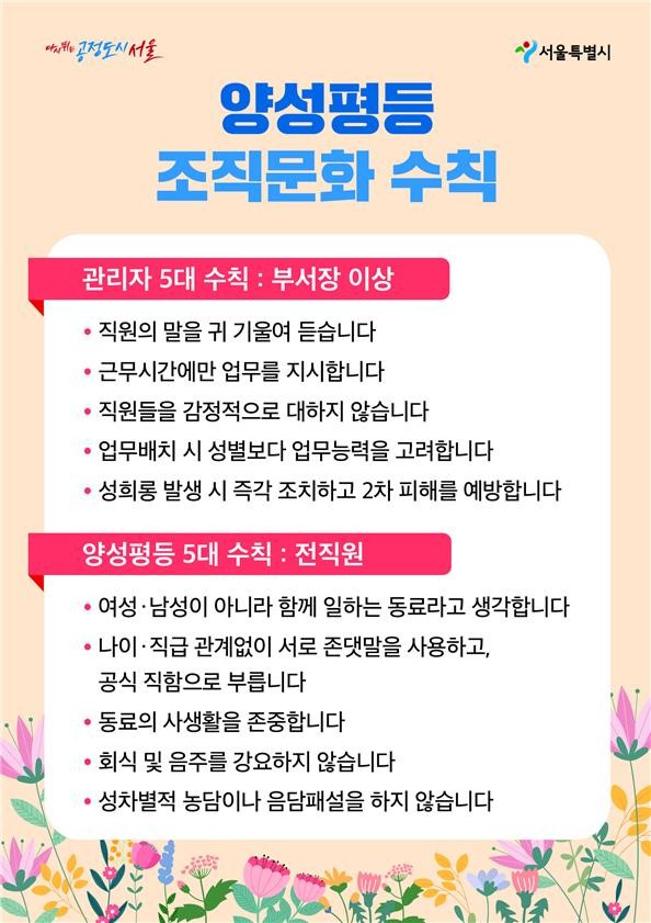 먼저, 직장 내 성희롱‧성폭력의 주요 원인의 하나인 수직적‧권위적조직문화를 개선하기 위해 ‘양성평등 조직문화 수칙’을 제정·배포하고, 양성평등 조직문화 조성 자문단 ‘소확행(소통이 확산되어 행복한 서울시로!)’ 운영을 활성화한다.
