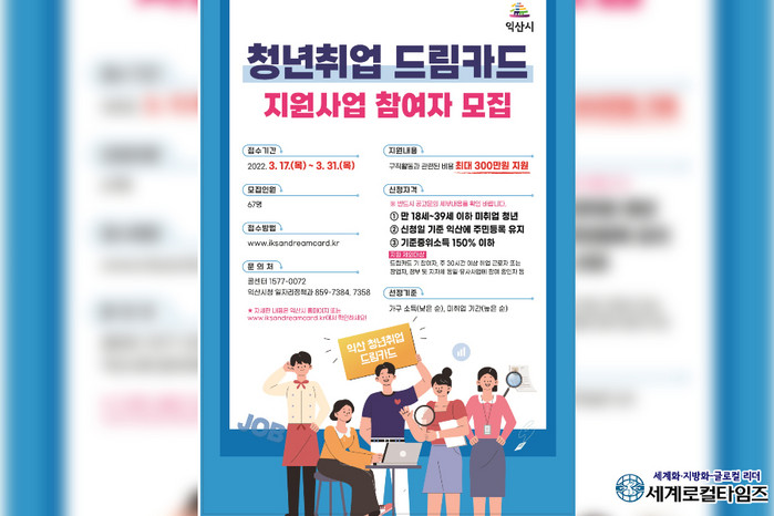 [세계로컬타임즈 조주연 기자] 전북 익산시가 ‘청년취업 드림카드’ 대상자를 오는 17일부터 31일까지 모집한다.