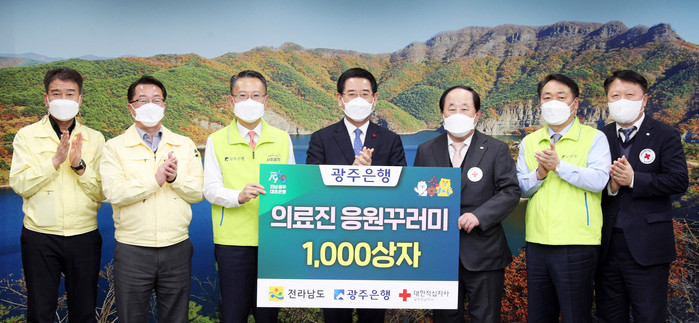 송종욱 광주은행장은 “코로나19로 피로도가 쌓였을 의료진에게 꾸러미가 힘이 됐으면 한다”며 “‘지역민과 동행, 지역과 상생’이라는 경영 이념을 실천하기 위해 앞으로도 노력하겠다”고 밝혔다.