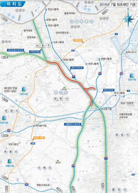 사업 구간은 경부고속도로와 용인서울고속도로가 만나는 판교 인근부터 우면산터널까지 약 10.7km로, 왕복 4차로로 조성된다. 추정 사업비는5,612억원(2016년 4월 1일 가격기준)이다.