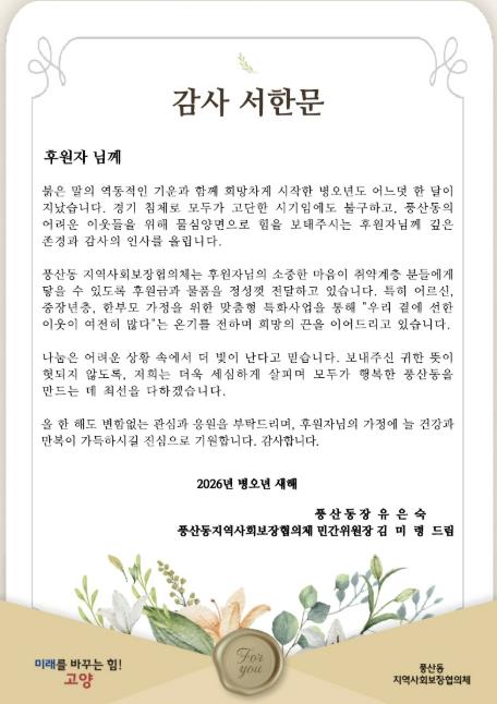 유은숙 풍산동장은 “지난해 지역사회와 이웃을 위해 나눔을 실천해주신 후원자분들에게 감사하다”며, “후원자분들의 선한 영향력이 지역사회에 널리 퍼질 수 있도록 함께 노력하겠다”고 덧붙였다.
