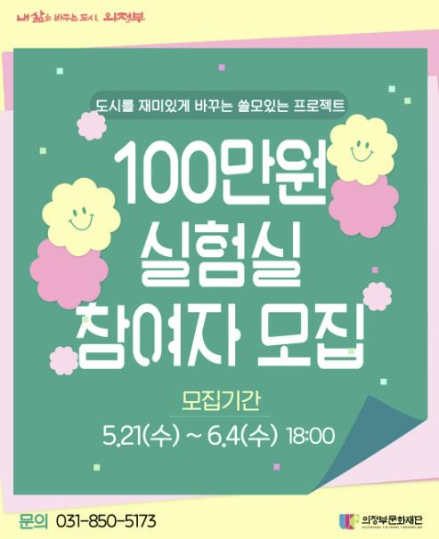 박희성 의정부문화재단 대표는 “'100만원실험실'은 시민의 아이디어가 도시의 문화로 확장되는 실험의 장”이라며, “많은 시민들이 용기 있게 도전하고, 이를 통해 문화도시 의정부의 다양한 변화를 함께 만들어가길 기대한다”고 밝혔다.