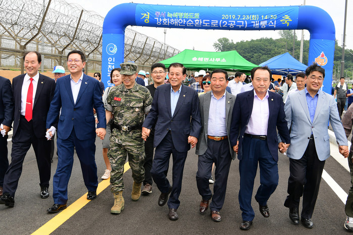 | ▲유천호(가운데) 강화군수 등이 강화해안순환도로 개통식에서 손을 맞잡고 걸어가고 있다. |