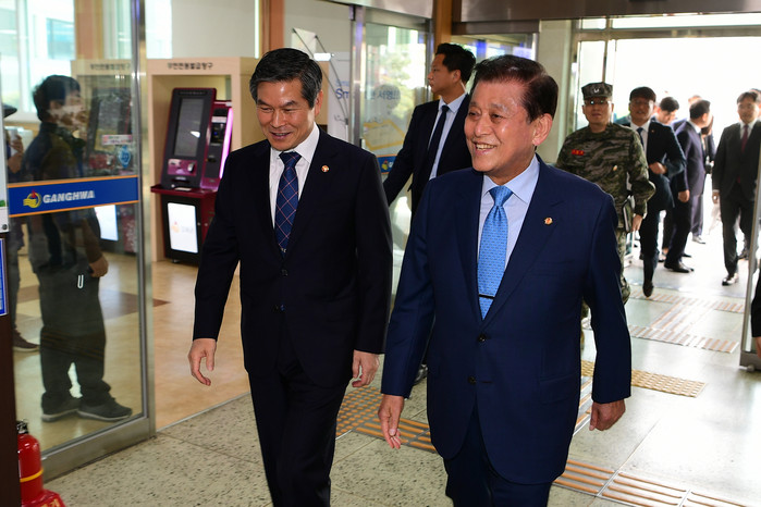 | ▲유천호(오른쪽) 강화군수가 행사 후 군청으로 들어서고 있다. |