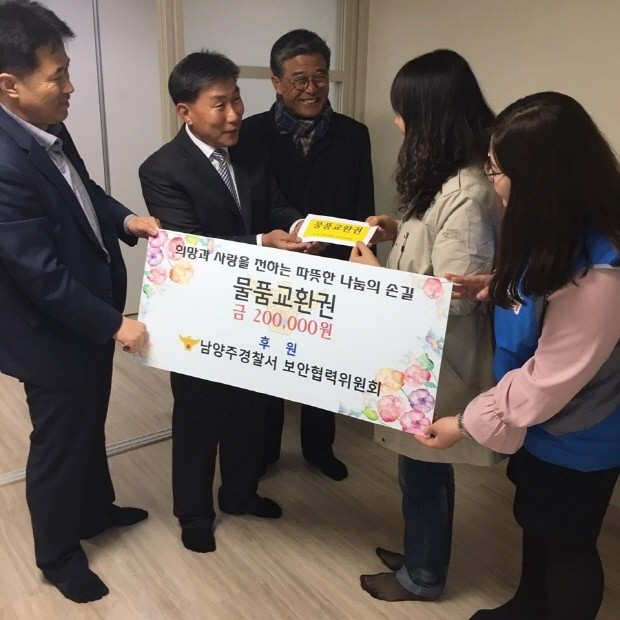 | ▲ 남양주경찰서 보안협력위원회가 북부희망케어센터에 물품교환권 20만원을 전달하고 있다.<사진제공= 남양주시청> |