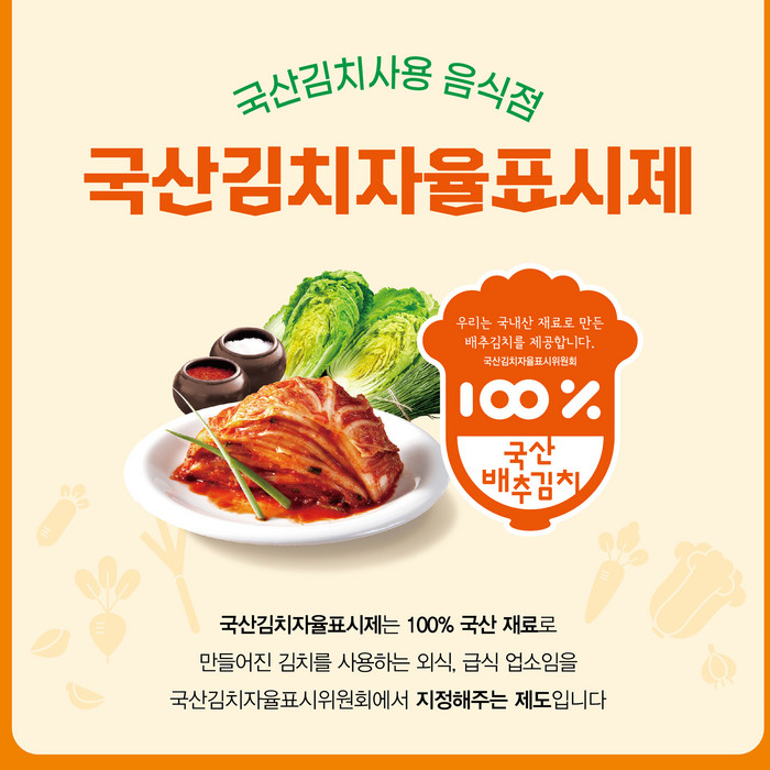 국산김치 자율표시제는 100% 국산 재료로 만든 김치를 생산·유통업체로부터 구매하거나 직접 만들어 사용하는 음식점과 급식업체를 ‘국산김치 사용업소’로 인증하는 제도다.