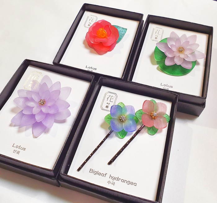 사과꽃, 연꽃, 벚꽃 등을 주제로 한 ‘아이 러브 경북’은 브로치·귀걸이·배지·머리핀 등에 경북의 꽃을 표현했다.