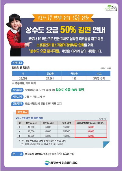 이번 혜택은 일반용과 욕탕용을 대상으로 3월부터 5월 부과분에 대한 상수도요금 50%를 7월에서 8월 고지분에 차감 고지해 별도의 신청 없이 일괄 감면 혜택을 제공키로 했다.