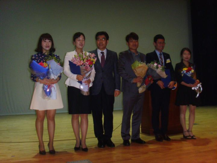 | ▲ 26일 경남도청 신관 대강당에서 열린 ‘2016년 Best 친절공무원 콘테스트’에서 선정된 친절공무원 5명이 시상 후 기념촬영하고 있다. 사진 왼쪽부터 최우수 정순임씨 우수 정미정씨, 박주일씨, 김봉태 도 대민봉사과장, 장려상 박거성씨, 진예슬씨.<사진제공=경남도청> |