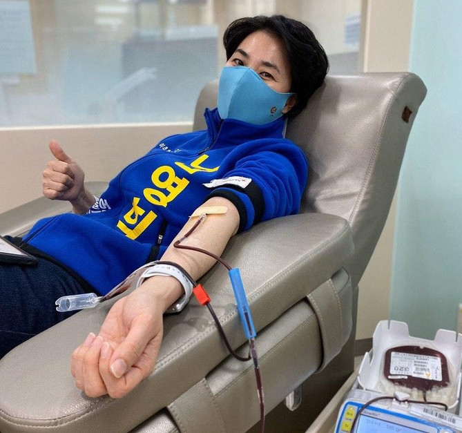 | ▲남영희 후보가 직접 헌혈하면서 헌혈운동에 동참해 줄 것을 호소하고 있다. (사진=남영희 후보 사무소 제공) |