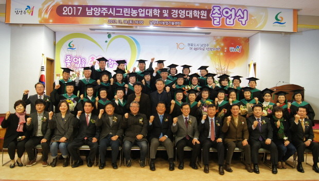 [세계로컬신문 고성철 기자] 경기도 남양주시(시장 이석우)는 지난 18일 그린농업대학 이석우 학장, 시의회 의장을 비롯한 내빈과 졸업생, 하객 등 300여 명이 참석한 가운데 농업기술센터 대강당에서 '2017년도 남양주시그린농업대학 및 경영대학원 졸업식'을 개최했다고 20일 밝혔다.