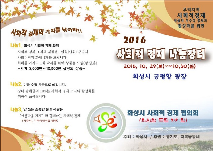 [세계로컬신문 최원만 기자] 경기도 화성시는 우리지역 사회적경제 제품의 우수성 홍보를 위해 오는 29일과 30일 서신면 궁평항 광장에서 ‘2016 사회적경제 나눔장터’를 연다.