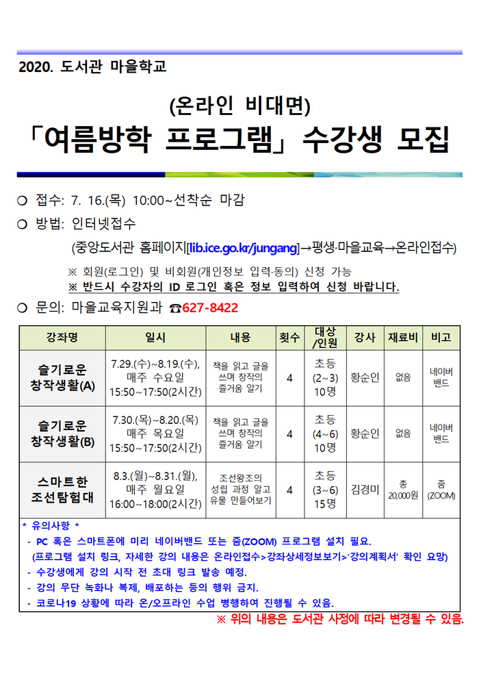 이번 프로그램은 네이버 밴드, 줌(ZOOM)을 활용해 비대면 온라인으로 진행되며, 개설 강좌로는 초등(2~3학년) 대상 ‘슬기로운 창작생활(A)’, 초등(4~6학년) 대상 ‘슬기로운 창작생활(B)’, 초등(3~6학년) 대상 ‘스마트한 조선탐험대’ 총 3개 프로그램이 운영된다.