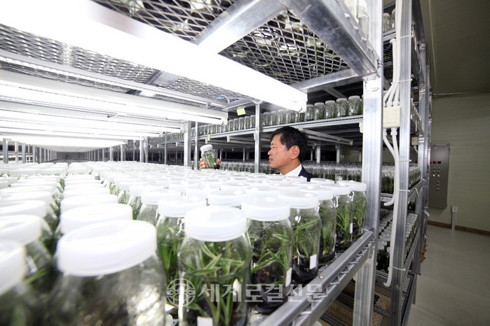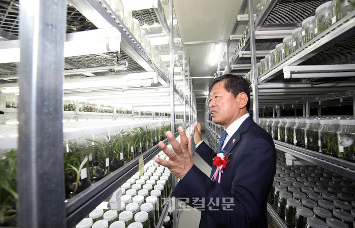 | ▲ 라승용 농촌진흥청장이 24일 오전 전북 김제의 한 춘란 관련 영농농업법인 개소식에 참석해 배양실을 둘러보고 있다. |
