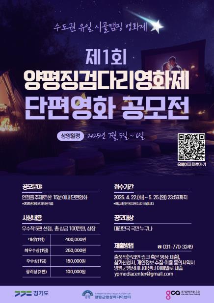 작품 접수는 5월 25일까지 진행되며, 예심을 거쳐 본선에 진출한 작품들은 7월 5일부터 6일까지 열리는 ‘2025년 제1회 양평징검다리영화제’에서 상영된다. 본선 진출작 중 우수작 5편을 선정해, 대상은 상금 40만 원, 최우수상은 상금 25만 원, 우수상은 상금 15만 원, 장려상은 상금 각 10만 원이 수여될 예정이다.