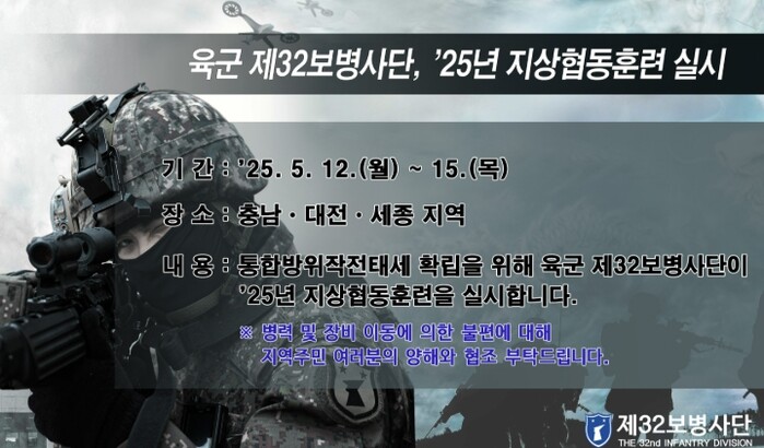 육군 32보병사단은 실전적인 지상협동훈련을 통해 책임지역 내 위기 발생 시 완벽한 통합방위작전을 통해 `지역 주민과 함께하는` 지역방위 부대로서의 소임을 다할 것이라고 밝혔다.