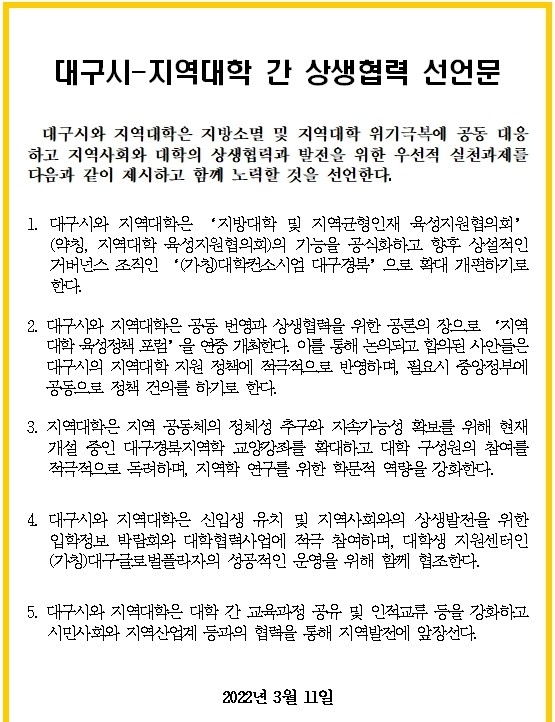 상생협력 선언문은 지방대학 및 지역균형인재 육성지원협의회 공식화, 지역대학 육성 정책포럼 지속 개최 및 논의된 안건 정책반영, 대구경북지역학 교양강좌 확대, 대학 협력사업 참여 및 전국 최초 대학생 지원센터인 (가칭)대구글로벌플라자의 성공적 운영 협조, 대학 간 공유강화와 시민사회 및 지역산업계 등과의 협력을 통해 지역발전 견인 등의 내용이 담겨져 있다.