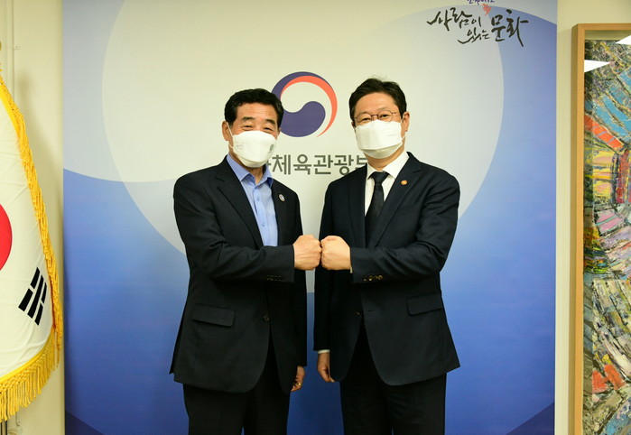 | ▲ 윤화섭 안산시장(사진 좌)이 황희 문체부 장관을 만나고 있다.(사진=안산시) |