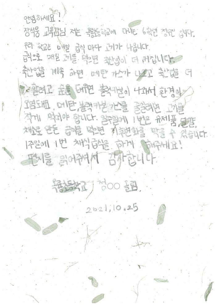 학생들은 편지에서 “급식으로 매일 고기를 먹으면 축산업이 커지게 되지만, 축산업을 더 하려고 숲을 태우면 블랙카본이 나와서 환경이 오염된다”고 지적했다. 이어, “블랙카본을 줄이려면 고기를 적게 먹어야 한다.”면서 “1주일에 한 번은 유제품과 달걀, 채소로 만든 급식을 먹게 해달라”고 건의했다.