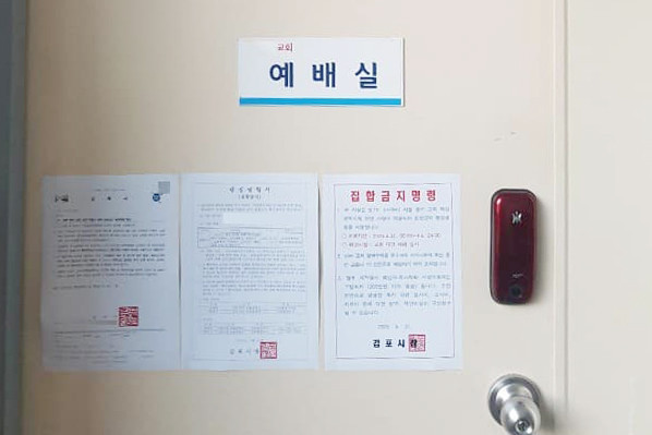| ▲ 대면예배를 강행한 김포시 한 교회의 예배실에 집합금지 행정명령 부착돼 있다. (사진=김포시 제공) |