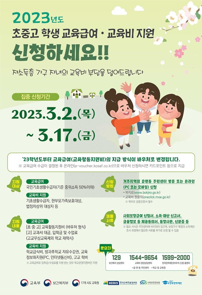 교육급여 중 교육활동지원비의 경우 2023년부터 현금 지급이 아닌바우처 지급방식으로 변경 운영되므로, 교육급여 지원 대상인 만 14세 이상 학생(학부모)은 이바우처를 통해 반드시 별도의 바우처 지급 신청을 해야 한다.