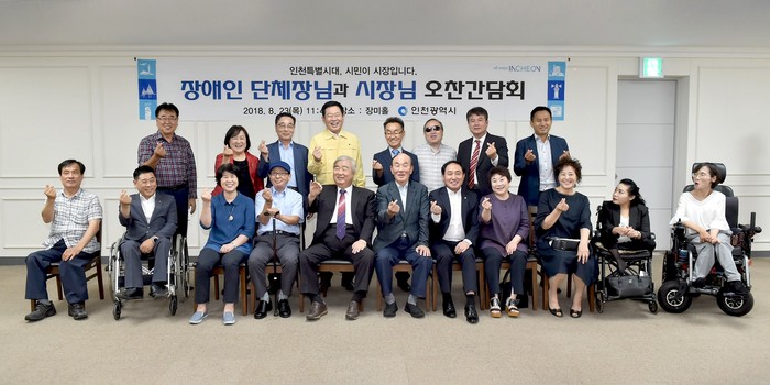 | ▲ 박남춘 시장과 장애인단체장이 시청에서 오찬간담회후 손가락 하트를 보이고 있다. (사진=인천시청 제공) |