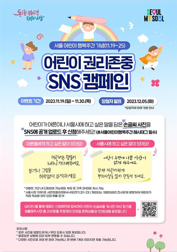 ‘어린이 권리존중 SNS 캠페인’은 20일에서 23일까지 서울시청 지하1층 시민청갤러리에서 진행되는 ‘어린이권리 전시회’와 연계해 추진된다.