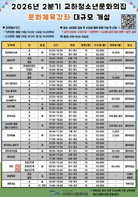 이와 함께 기존에 안정적으로 운영되며 높은 만족도를 보여준 ▲창의미술 ▲한자교실 ▲레고교실 ▲코딩 ▲생태교실 강좌 역시 지속적으로 운영되어, 청소년들에게 한층 더 넓고 깊이 있는 선택의 폭을 제공할 예정이다.
