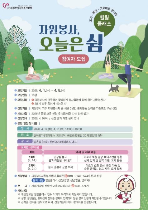 의정부시자원봉사센터 정진선 센터장은 “이번 힐링 클래스가 바쁜 일상과 봉사활동 속에서 잠시나마 자신을 돌아보고 재충전할 수 있는 소중한 시간이 되길 바란다.”며, “앞으로도 자원봉사자들이 건강하고 행복한 봉사 환경을 조성할 수 있는 다양한 프로그램을 확대해 나가겠다.”고 밝혔다.