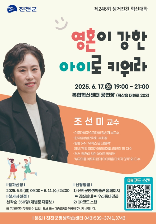 조 교수는 이번 강연에서 ‘영혼이 강한 아이로 키워라’를 주제로, 자녀가 공부뿐 아니라 인생을 주도적으로 설계하고 실천할 수 있도록 부모가 취해야 할 태도와 행동에 대해 설명한다.