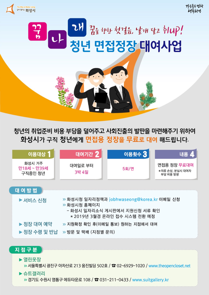 경기 화성시는 청년들의 취업준비 비용 부담을 덜어주고, 사회진출의 발판을 마련해 주기 위한 면접정장 대여사업인 ‘꿈나래’를 2월부터 12월20일까지 운영한다.