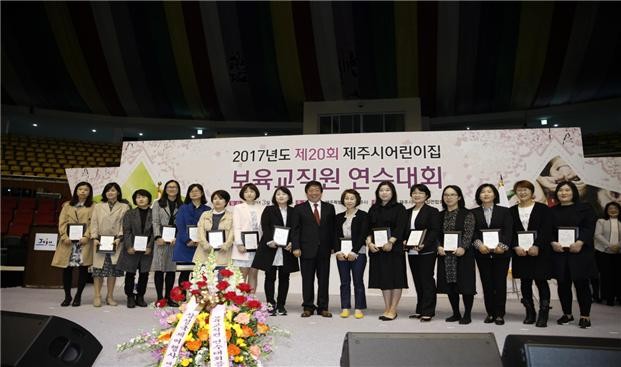 | ▲ 지난 25일 한라체육관에서 열린 제주시어린이집 보육교직원연수대회에서 유공자 표창을 받은 수상자들이 기념촬영하고 있다.<사진제공=제주시청> |